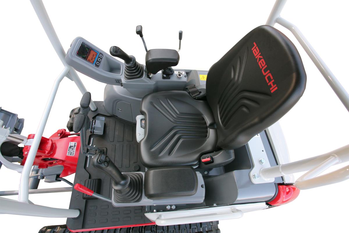 La postazione operativa del nuovo escavatore Takeuchi TB320 è progettata per offrire un supporto lombare ottimale per garantire un'esperienza di lavoro confortevole ed efficiente. Il sedile idrorepellente in PVC, completamente regolabile in altezza, inclinazione e profondità, è dotato di braccioli che forniscono supporto a gomiti e polsi.